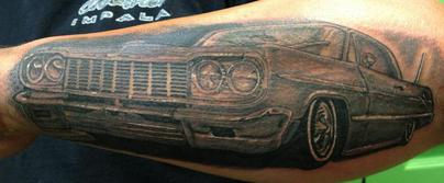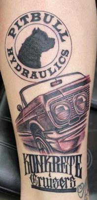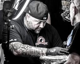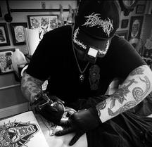 Introducing the leader of the gang known as Konkrete Jungle, say "Hi" to Chris. The man of many names also goes by Big Chris, Big Esco, The Vanilla Gorilla, King of Urban Script, Big Hungry the Buffet Assassin & The Lettering Guru aka Dave Letter-man... just to name a FEW. Originally from Columbia, Chris bounced around the state in his early years only to eventually end up back where it all started with Columbia's very first Tattoo Shop. Talk about coming full-circle. The Jungle was originally based in the hood of West Baltimore, where the team got the ball rolling and started making a name for themselves. Chris would spend endless late nights at the shop tattooing whoever came in, no matter how late it was. Now, lets rewind back even further to the days before Chris was running his own shop. An up and coming tattooer, Chris was perfecting a style of graffitti-based new-skool form of tattooing. Unfortunately for him, that style hadn't yet caught on in most shops. Therefore, Chris was turned away by most places he applied to work at. The sad thing was, as he put it "most of the people slamming the door in my face were guys who's portfolio's SUCKED". Undeterred, Chris decided to say fuck it, and make it on his own. Fast forward to the current day and it's obvious that he did in fact "Make It" as he now tattoos at and owns one of the dopest shops around. Big Hungry not only has an eye for art, but also an eye for talent as he has surrounded himself with a stable of all-star talent making Konkrete Jungle one of the best shops in the DMV. If not in the shop, you can catch Chris rolling around town in one of his OG West Coast Lowriders, showing the East Coast what it's like to hit the 3-wheel motion!