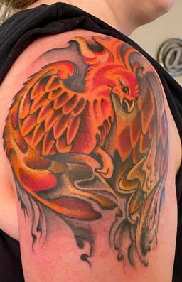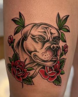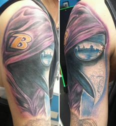 This is James. He is a tattoo artist in the game now for more than a decade. James started an apprenticeship at a shop in Baltimore, and since then has been perfecting his trade through being amazing!! In tattooing and piercing both, James makes a life in the tattoo world to help him take care of his now adult son and super loveable pup Dozer! James also since become a "Falconer", ask him about his birds! He's happy to share the information!