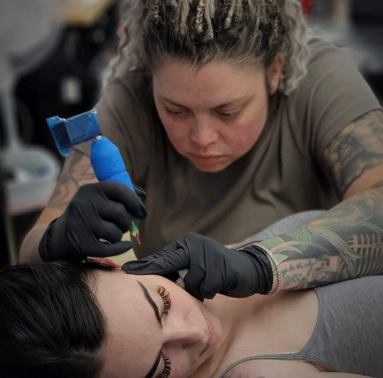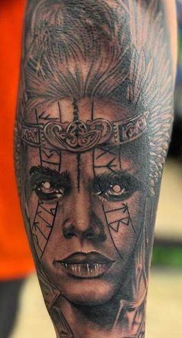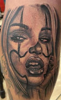 Meet Sarah, the one and only Queen of Tattoos! This lovely lady is the glue behind the scenes that keeps Konkrete Jungle running like a well-oiled machine. On top of the million things she takes care of on a daily basis, she also manages to tattoo...and tattoo WELL!!! The beautiful bride of our very own Chris, Sarah got into tattooing by surprise. A lifelong art fan, Sarah focused her abilities on photography in the early stages. After being around Chris and watching him perfect his craft, she shocked him one day by confessing that she not only wanted to, but felt she was ready to try tattooing. Not long after that she started working on her first tattoos and has been kicking-ass ever since. When asked about that whole process, she explained that while being around the shop helping out with everything, that she was "on a 5 year apprenticeship when looking back at it". That kind of dedication shows in the perfectly crafted pieces she puts together on a daily basis. Outside of tattooing, Sarah has another passion...her Pitbull Rescue (Saving Grace). She takes the rescue just as serious as she does tattooing, and there are plenty of Pitties that are VERY thankful for that. Where she finds the time to do all she does is beyond me, but I sure am glad she makes it all happen. Having a female tattoo artist adds soo much to The Jungle. Now customers not only have their pick of great artists, but they can choose whether they want to get inked by a male or female. And trust me when I say this, Sarah can hang with any guy in the industry. We are a lucky crew to have Sarah on our team. Not every shop can say they have a completely bad-ass, super-talented "Tattoo Chick". But....WE can!!!