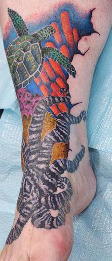 Although he was just new to the tattoo world for employment, he was also fairly new to the tattoo world as a collector. He got his first tattoo at 25 years old, and will only be 36 this year, so has collected all these tattoos in just 5 years. But don't ask him how many tattoos he has, he'll tell you 6. However, 50% of his body is covered! 2 sleeves, both feet (including toes) and his entire back including rib cage, and chest! He's not addicted, HE'S COMMITTED!!